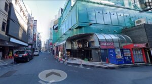 50mほど歩くと右手にシンスユー本店のはいる興和ビルが見えます。 パステルグリーンのビルが目印です。