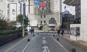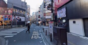 花道通りをしばらく歩いた先にあるホストの看板が立ち並ぶ交差点を左折します