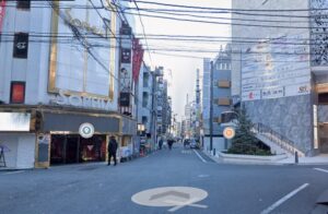 花道通りをしばらく歩いた先にあるホストの看板が立ち並ぶ交差点を左折します
