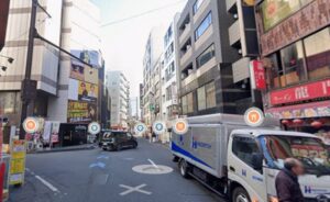 右折して正面に見えるカラオケ館の交差点を左折します 100mほど直進し、つきあたりの花道通りを右折します
