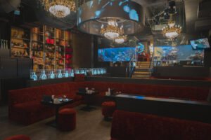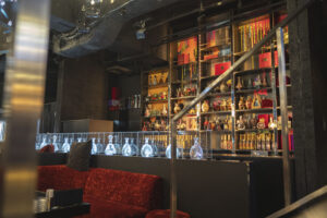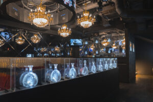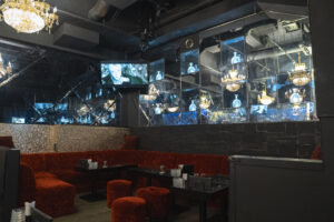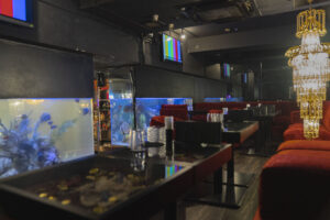 120坪規模の広さで、大きい水槽や豪華なシャンデリア、棚一面に並ぶ豪華なボトルたちが印象的なお店です。