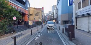 右折して正面に見えるカラオケ館の交差点を左折します 100mほど直進し、つきあたりの花道通りを右折します