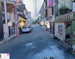 右折して正面に見えるカラオケ館の交差点を左折します 100mほど直進し、つきあたりの花道通りを左折します